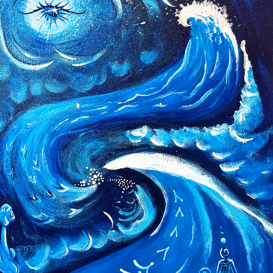 Cada elemento - o ser caminhando sobre uma onda, as formas que se entrelaçam, o átomo com um olho que tudo vê - é um fio dessa grande tapeçaria invisível que nos conecta ao que existe dentro e fora de nós.